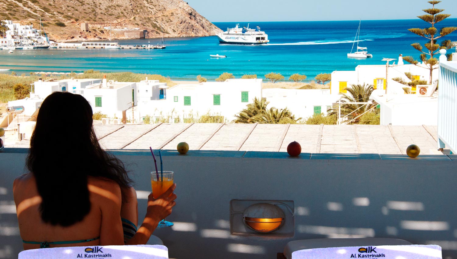 Cocktail and view of Kamares port and beach